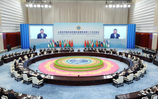 9月1日上午,上海合作组织成员国元首理事会第二十五次会议在天津梅江会展中心举行。中国国家主席习近平主持会议并发表题为《牢记初心使命 开创美好未来》的重要讲话。新华社记者 谢环驰 摄