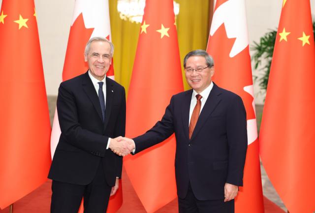 国务院总理李强1月15日下午在北京人民大会堂同来华进行正式访问的加拿大总理卡尼举行会谈。