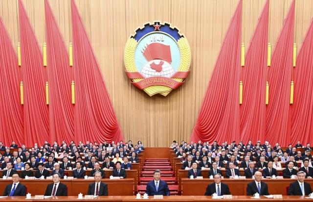 3月4日下午,中国人民政治协商会议第十四届全国委员会第四次会议在北京人民大会堂开幕。这是习近平、李强、赵乐际、蔡奇、丁薛祥、李希、韩正在主席台就座。新华社记者 燕雁 摄