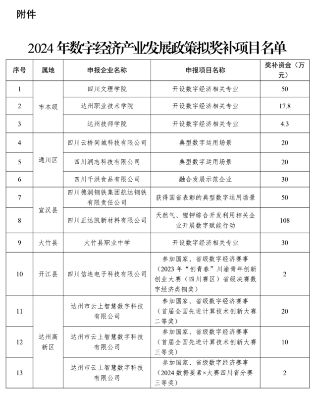 根据《达州市人民政府关于印发达州市促进数字经济产业发展的若干措施的通知》(达市府发〔2022〕20号)和《达州市数据局 达州市财政局关于组织申报2024年数字经济产业发展奖补政策的通知》(达市数发〔2024〕6号)等文件精神,市数据局、市财政局已组织完成项目申报、专家评审、实地核查、相关部门核实等程序,经市数据局党组会研究,拟对13个项目予以奖补,现对拟奖补名单予以公示。