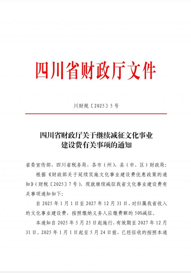 根据《财政部关于延续实施文化事业建设费优惠政策的通知》(财税〔2025〕7号),现就继续减征我省文化事业建设费有关事项通知如下: